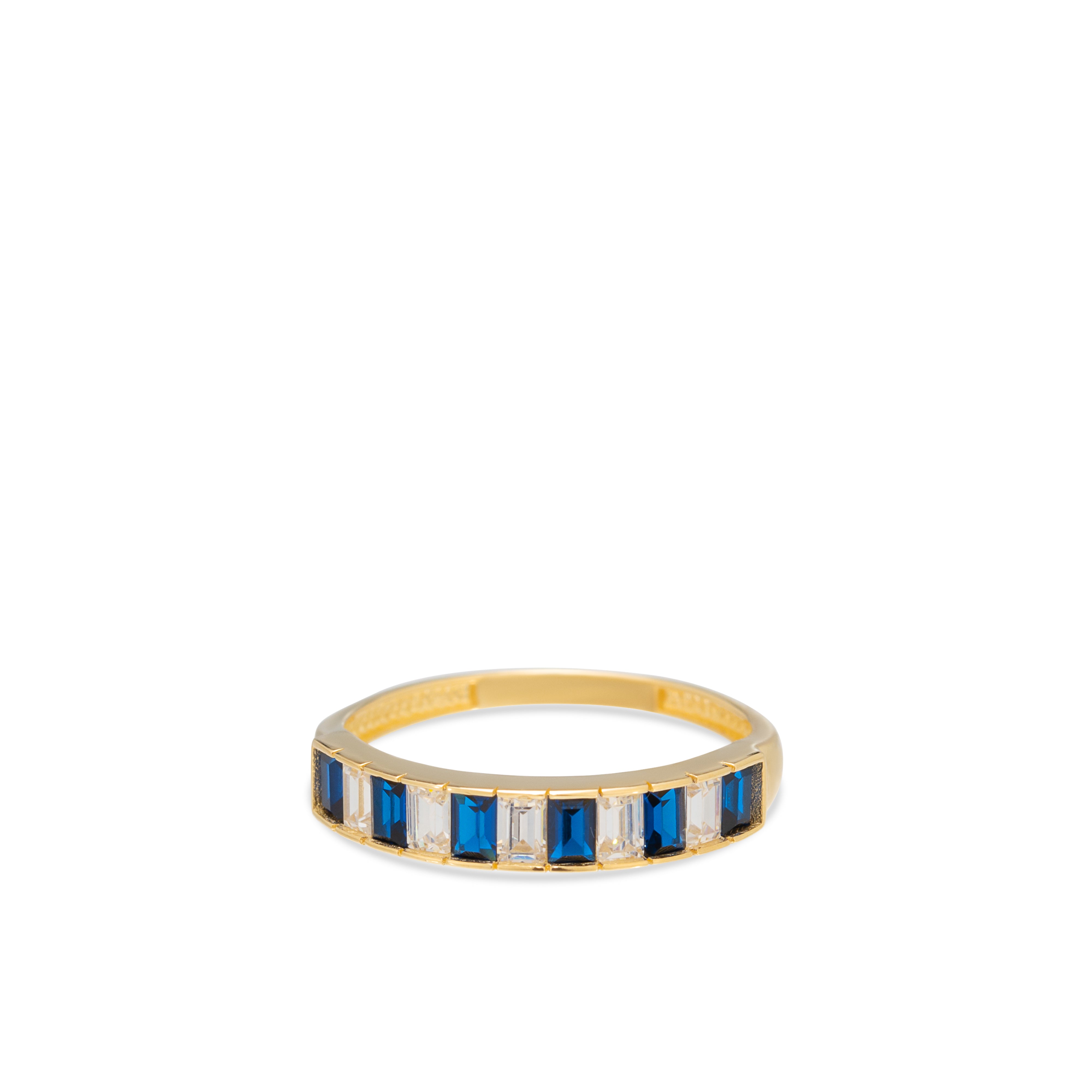 Acest superb inel din aur galben de 14 karate este de la Swing Jewels. Prezinta un zirconiu superb, albastru si alb, taiat bagheta, cu un finisaj lustruit. Randul de pietre are 19,3 mm latime si 3,7 mm lungime. Combina-l cu inelele suprapuse din colectie!