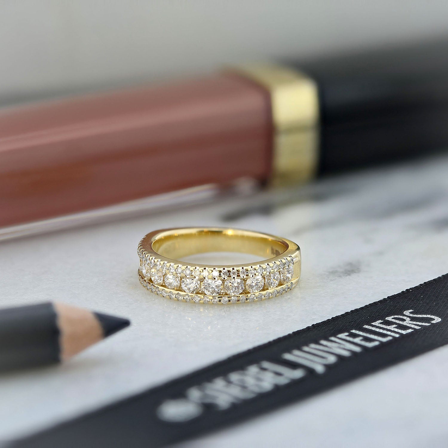 Acest inel din aur galben din colectia Millennium emana o eleganta opulenta cu un fler modern. Fabricate din aur galben de 14 karate si sertate cu 85 de diamante cultivate in laborator taiate stralucitor, insumand 1 carat, cele trei randuri de diamante stralucitoare creeaza un efect bogat, plin, care straluceste la fiecare miscare. O bijuterie de lux, care nu este perfecta doar pentru ocazii festive, ci poate fi purtata si ca verigheta stralucitoare: un simbol al iubirii cu stralucire de durata.