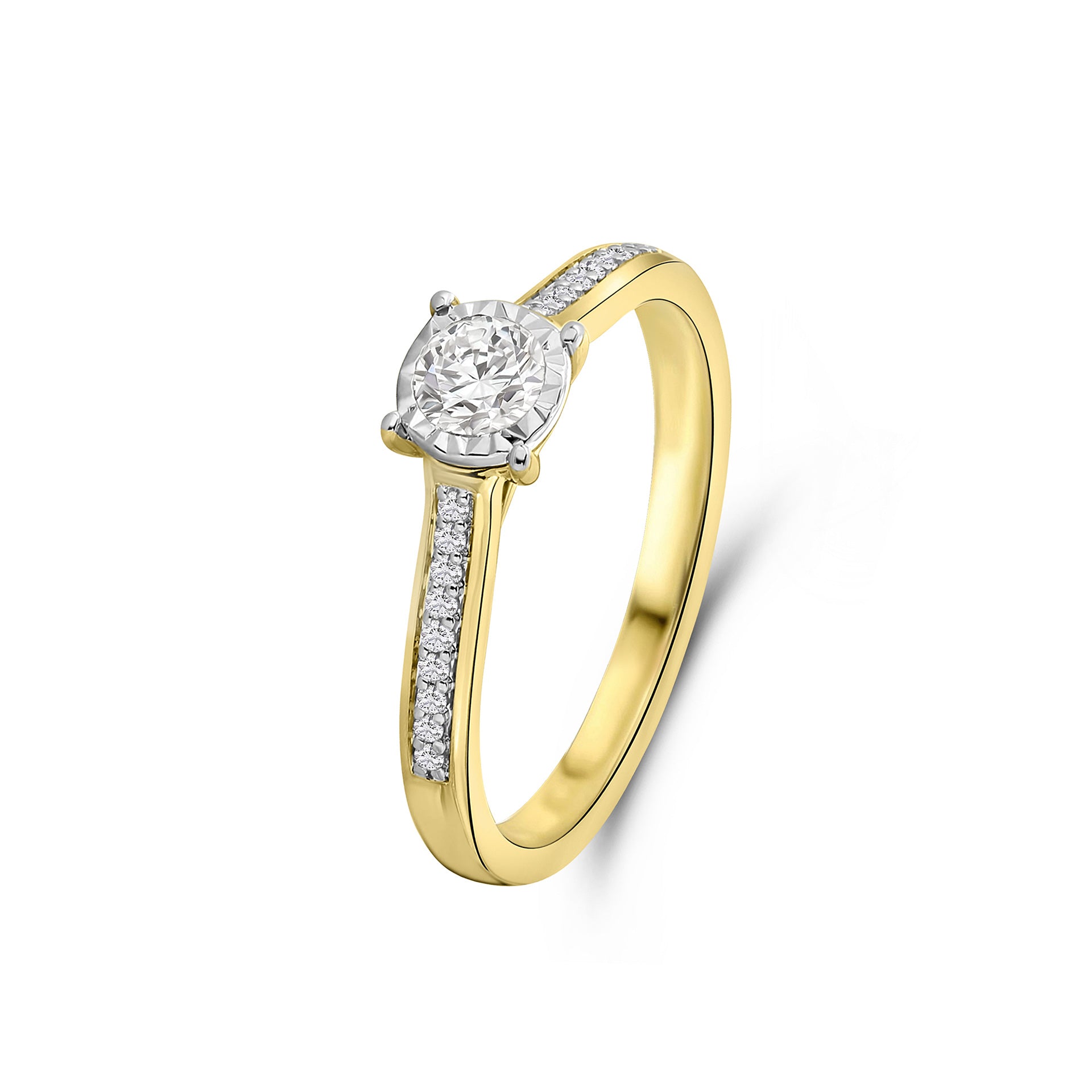 Acest frumos inel din aur galben de 14 karate de la Siebel este din colectia Millennium. Are un diamant uimitor cultivat in laborator. Cele 19 diamante artificiale taiate stralucitor au o culoare alba delicata, cantarind 0,07 ct (VS2). Piatra centrala este de 0,27 ct. Inelul este rafinat, elegant si are un aspect sic. Un plus frumos la colectia ta de bijuterii.