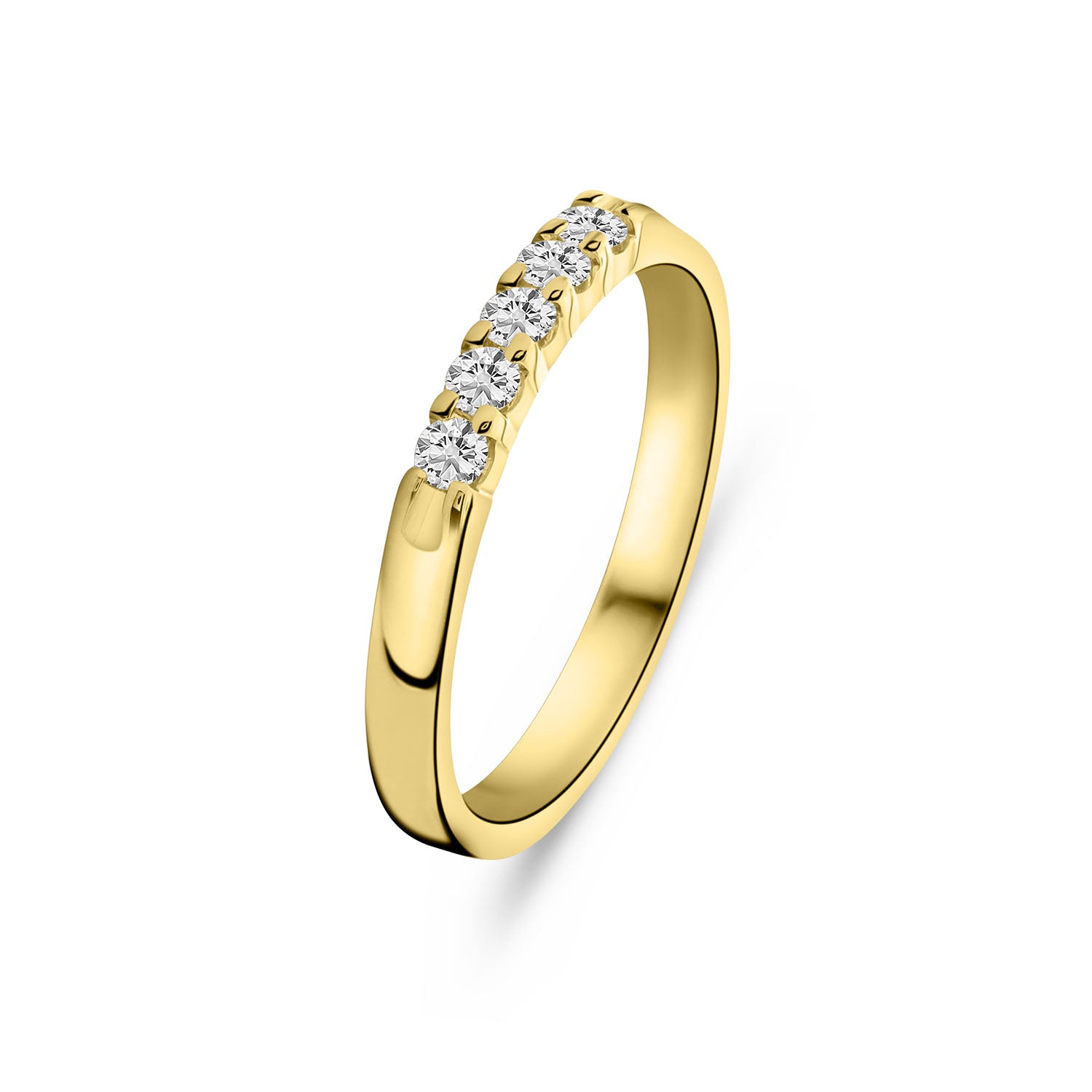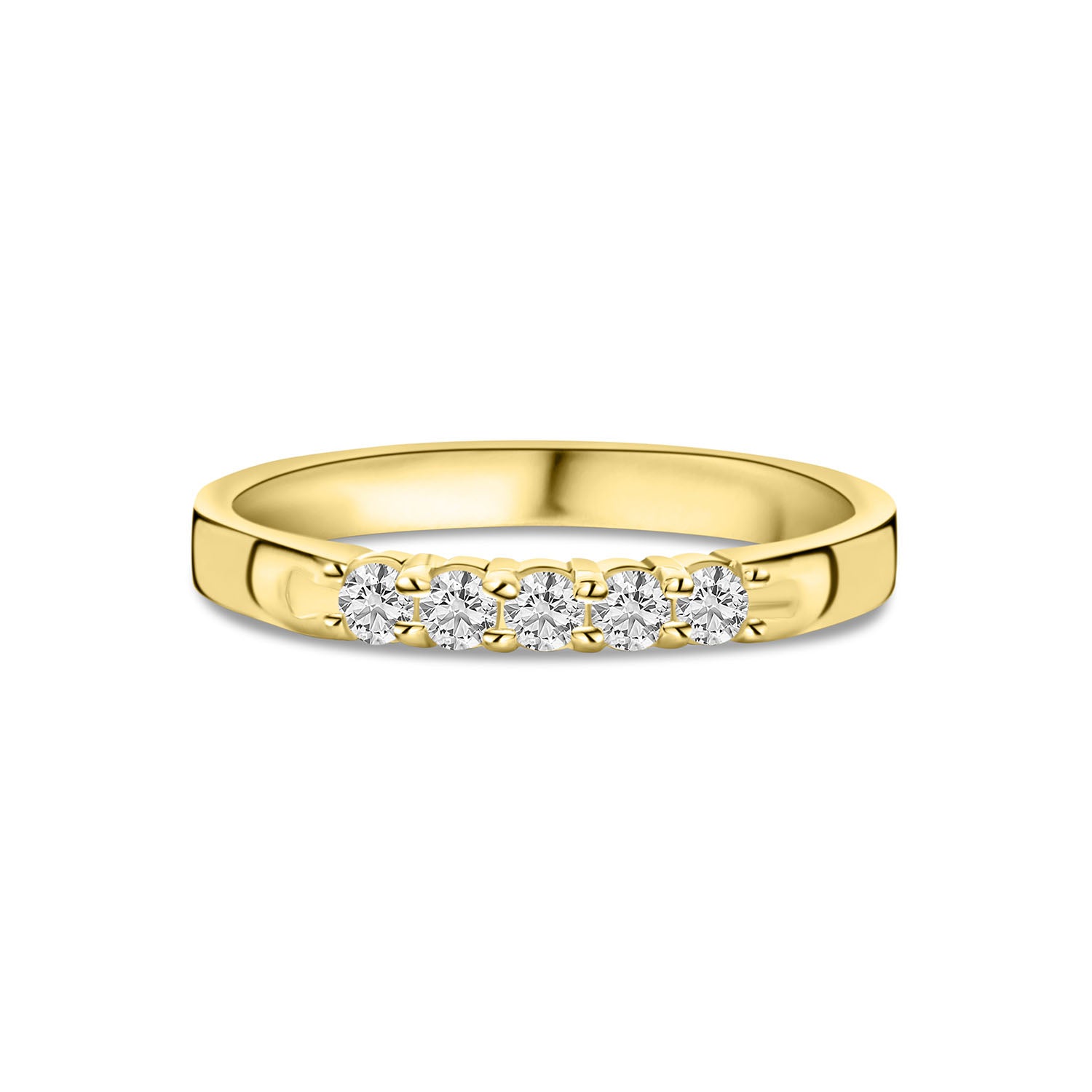 Acest inel din aur galben de 14 karate din colectia Millennium este un clasic elegant, cu o nota moderna. Inelul este sertat cu cinci diamante taiate stralucitor, cultivate in laborator, care impreuna creeaza o stralucire subtila si eleganta. Finisajul neted si designul elegant fac aceasta piesa atemporala si versatila. Perfect ca verigheta, inel stivuitor sau inel sofisticat. Acest inel este frumos purtat singur, dar si ideal pentru a fi combinat cu alte bijuterii pentru un aspect personal. Pentru cineva care apreciaza eleganta minimalista cu semnificatie de durata. Ideal ca amintire de durata a unui moment special.