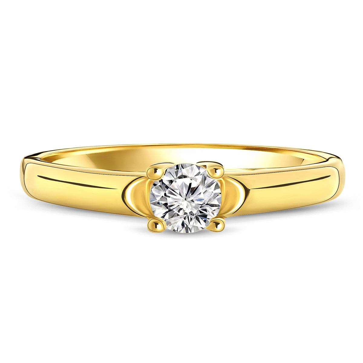 Acest inel din aur galben de 14 karate este sertat cu o singura piatra de zirconiu. Combinati-o cu o bratara eleganta pentru un aspect sic.