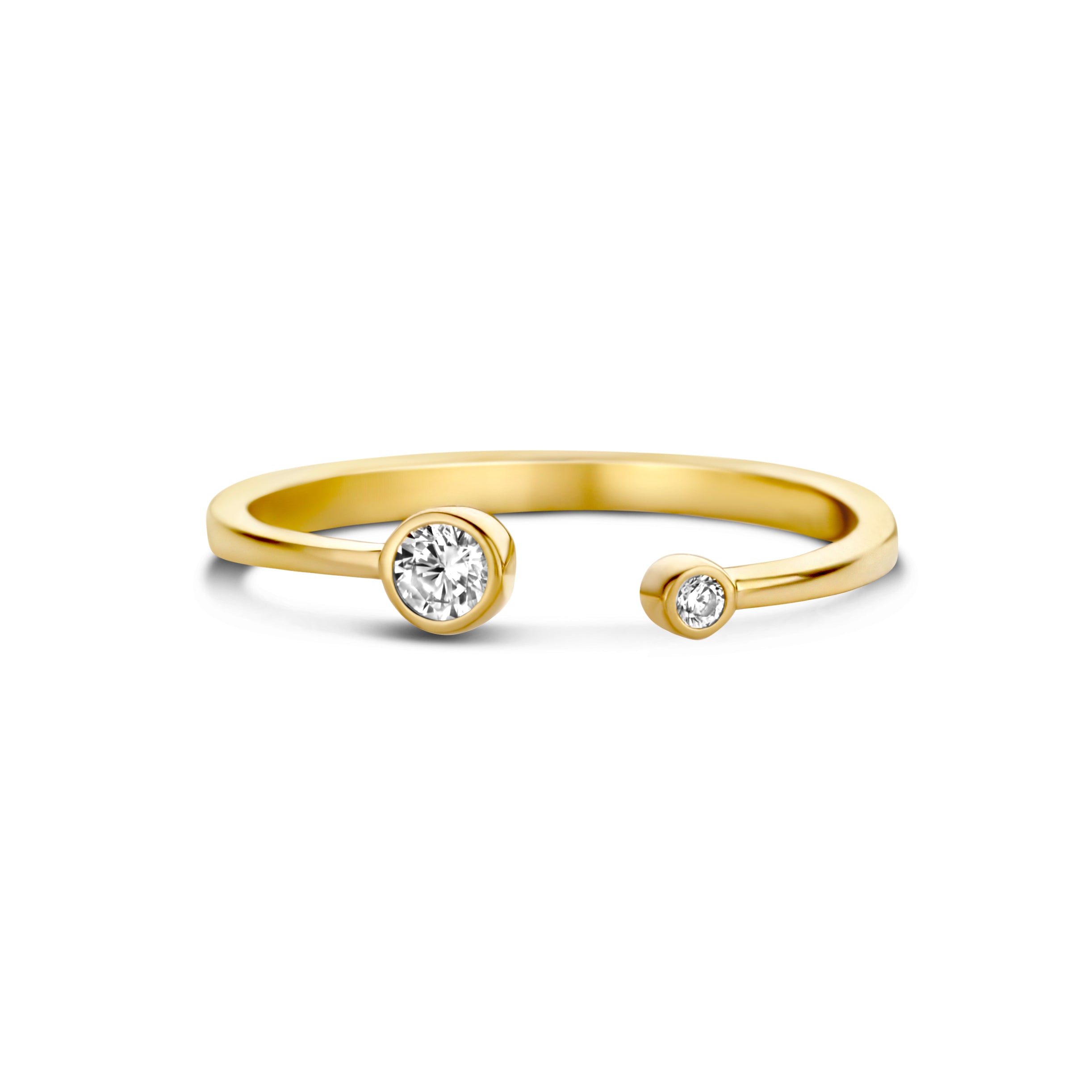 Inel din aur galben cu zirconiu ajurat din colectia Minimalistic. Fabricat din aur galben de 14 karate, inelul are doua pietre uimitoare din zirconiu. Pietrele de zirconiu nu sunt adiacente, dand inelului un aspect deschis. Asociati inelul cu alte bijuterii din colectie pentru a va completa look-ul.