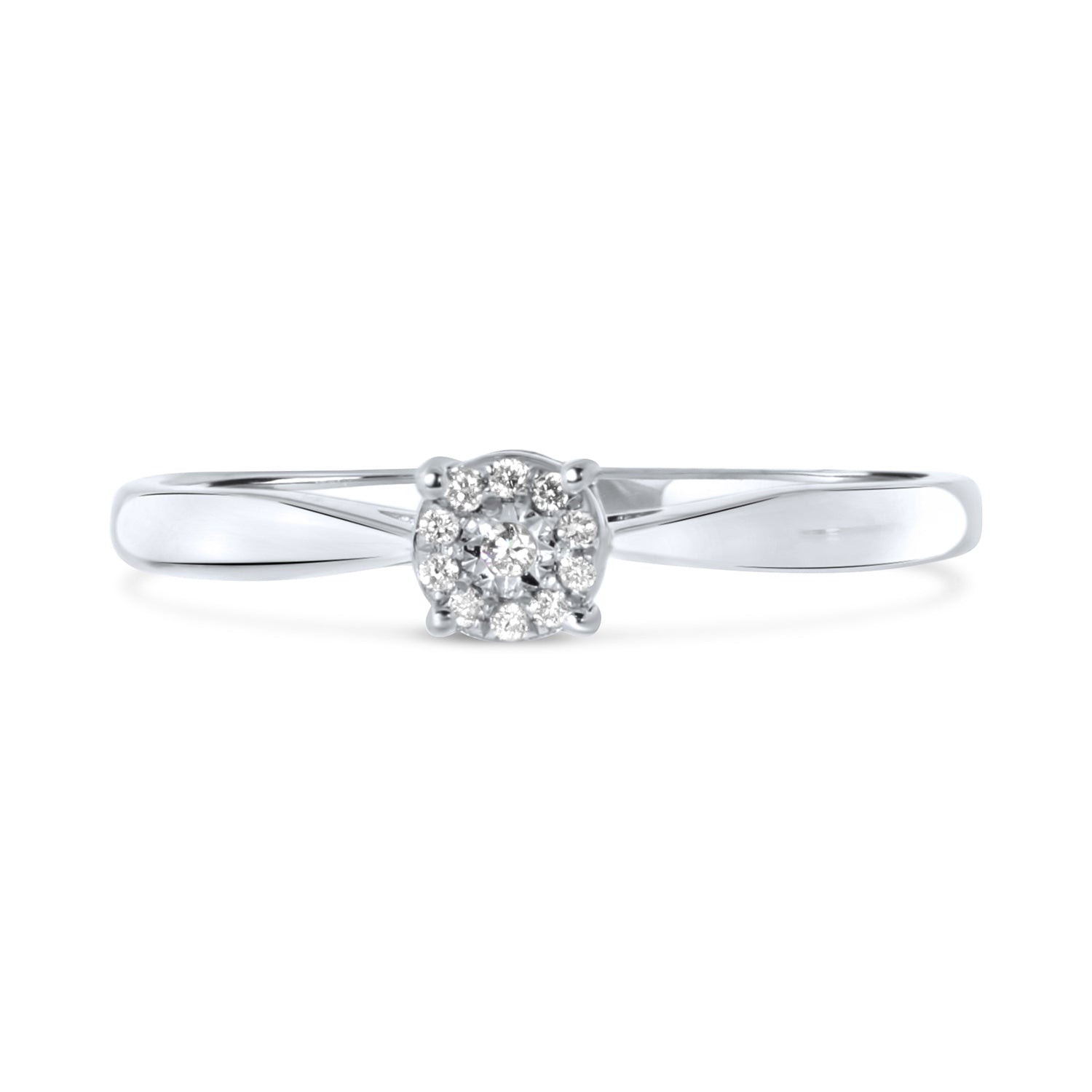 Un inel din aur alb de 14 karate din colectia Miracle. Inelul este sertat cu 11 diamante in chatonuri cu patru dinte. Un total de aproximativ 0,04 ct de diamante.