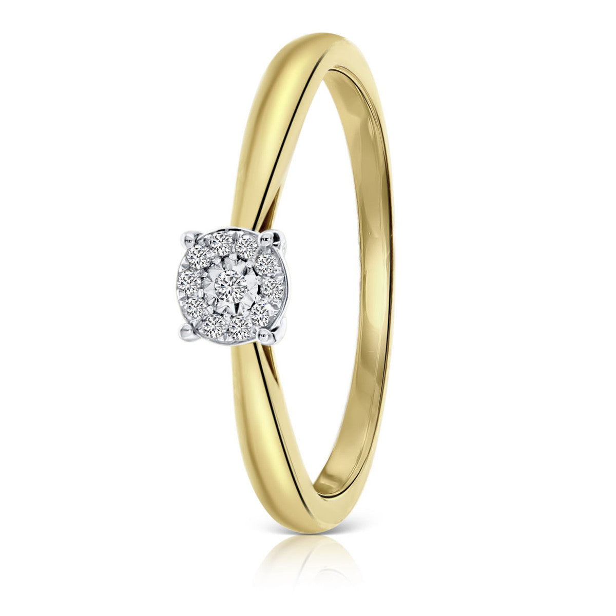 Un inel din aur galben de 14 karate din colectia Miracle. Inelul are un chaton din aur alb cu patru capete si este sertat cu un diamant mare si diamante mai mici. Greutatea totala a diamantului este de aproximativ 0,04 ct.