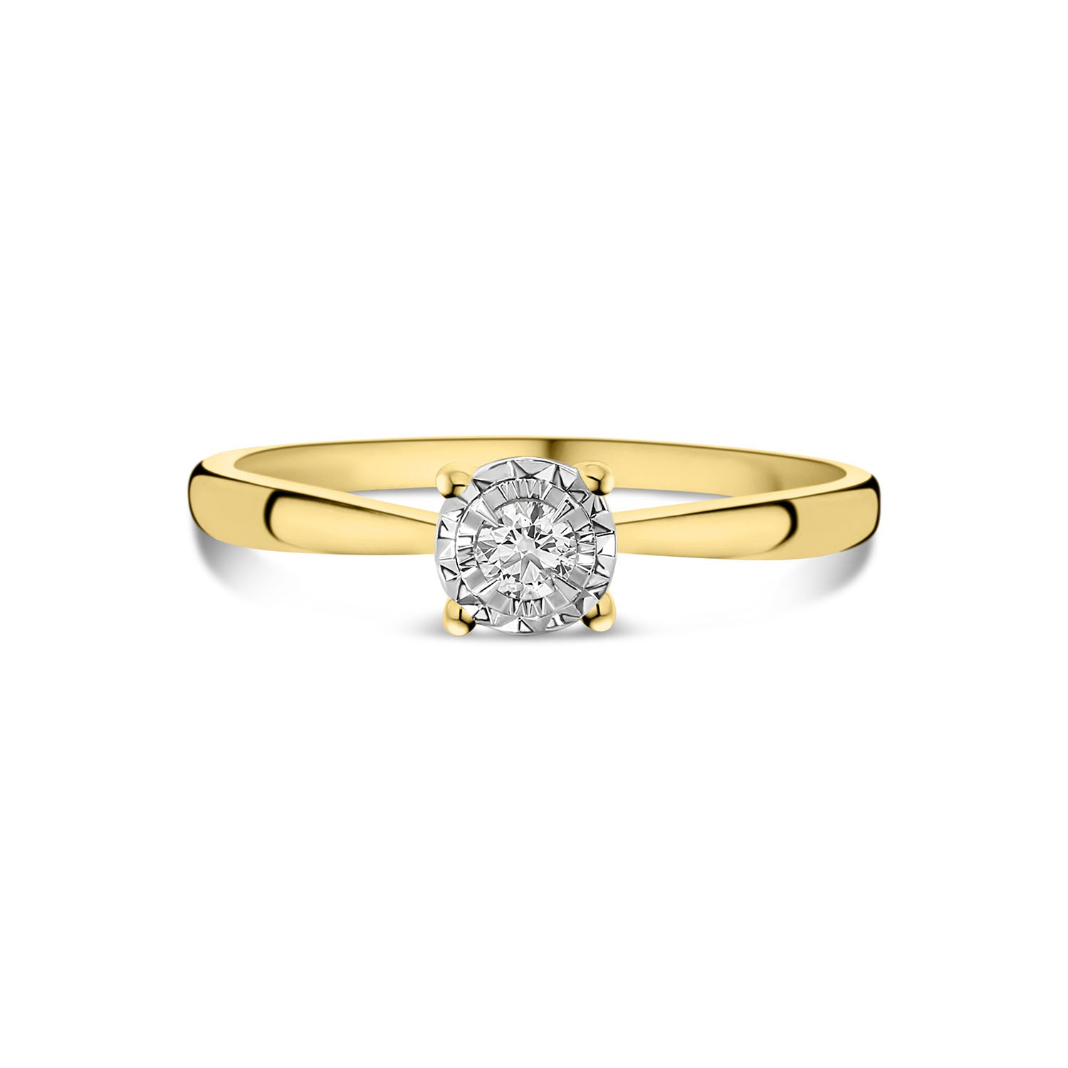 Inel din aur galben de 14 karate din colectia Miracle. Inelul are un diamant taiat stralucitor intr-o montura de aur alb.