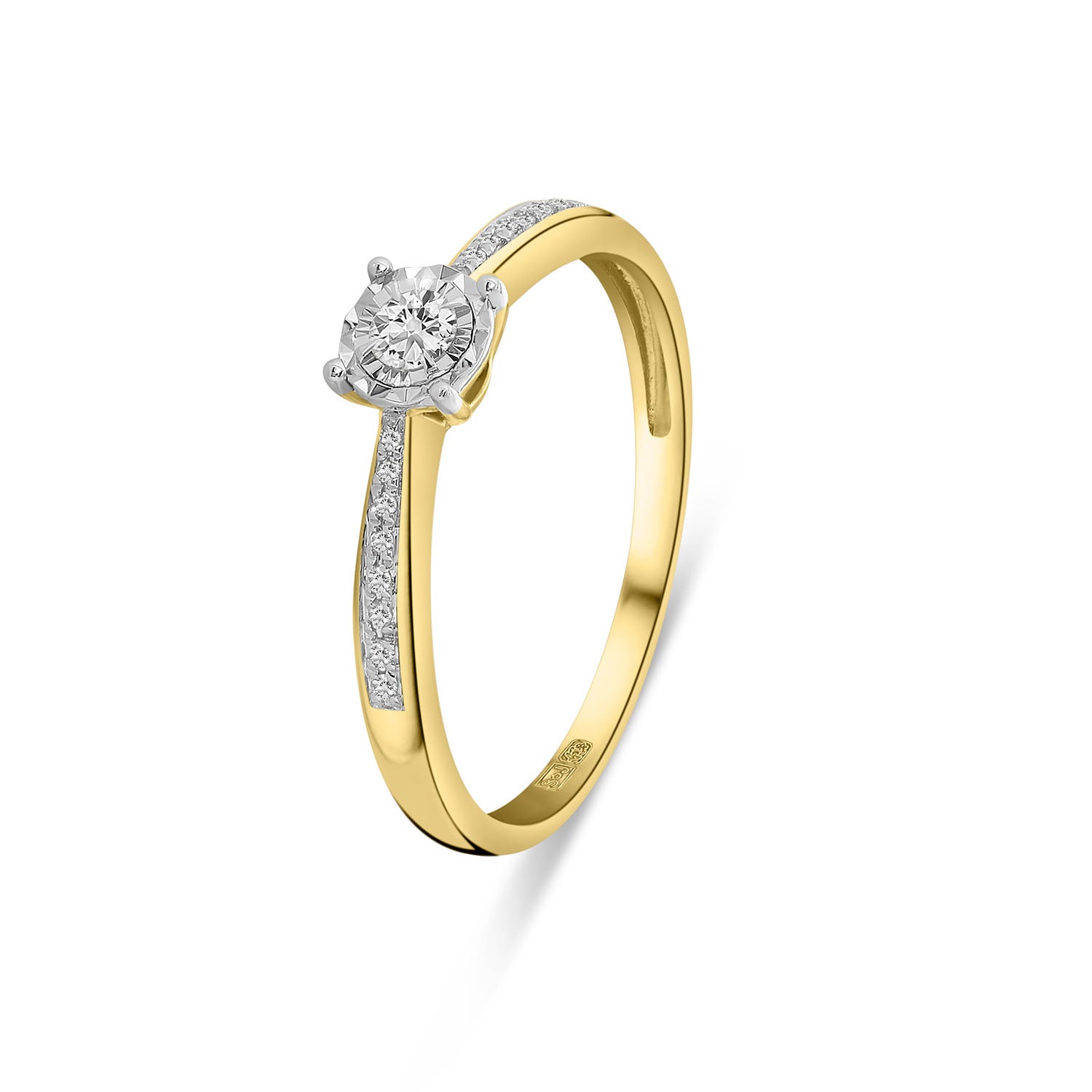 Inel din aur galben cu diamante din colectia Miracle. Fabricat din aur galben de 14 karate, inelul este sertat cu 17 diamante uimitoare taiate stralucitor. Cadrul este realizat din aur alb de 14 karate.