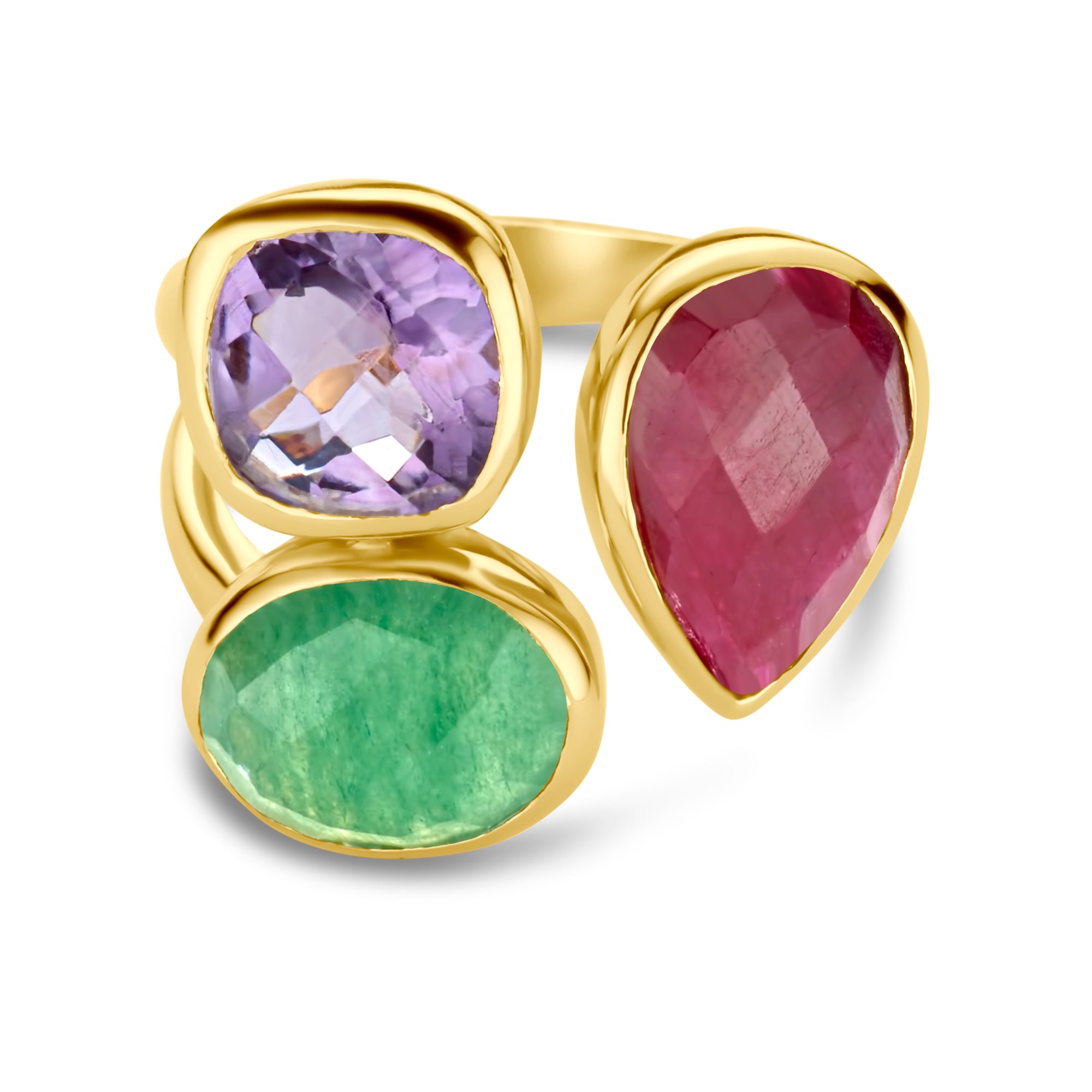 Acest frumos inel Salvatore Plata este realizat din argint 925 si are placat cu aur. Pietrele colorate in diverse forme creeaza un aspect unic. Pietrele in sine sunt facute din aventurin, ametist si rubin si au o stralucire frumoasa.