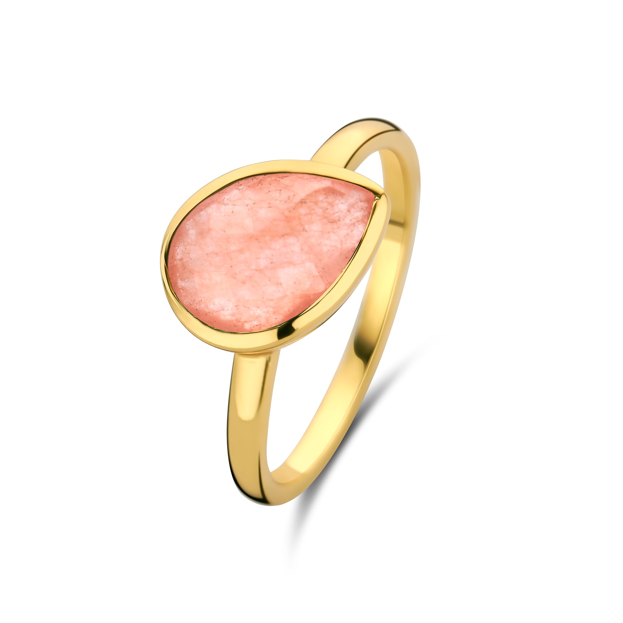 Inel de argint cu picatura de jad, jad portocaliu oval, calcit rotund si zirconiu alb. Inelul este realizat din argint sterling si apoi placat cu aur.