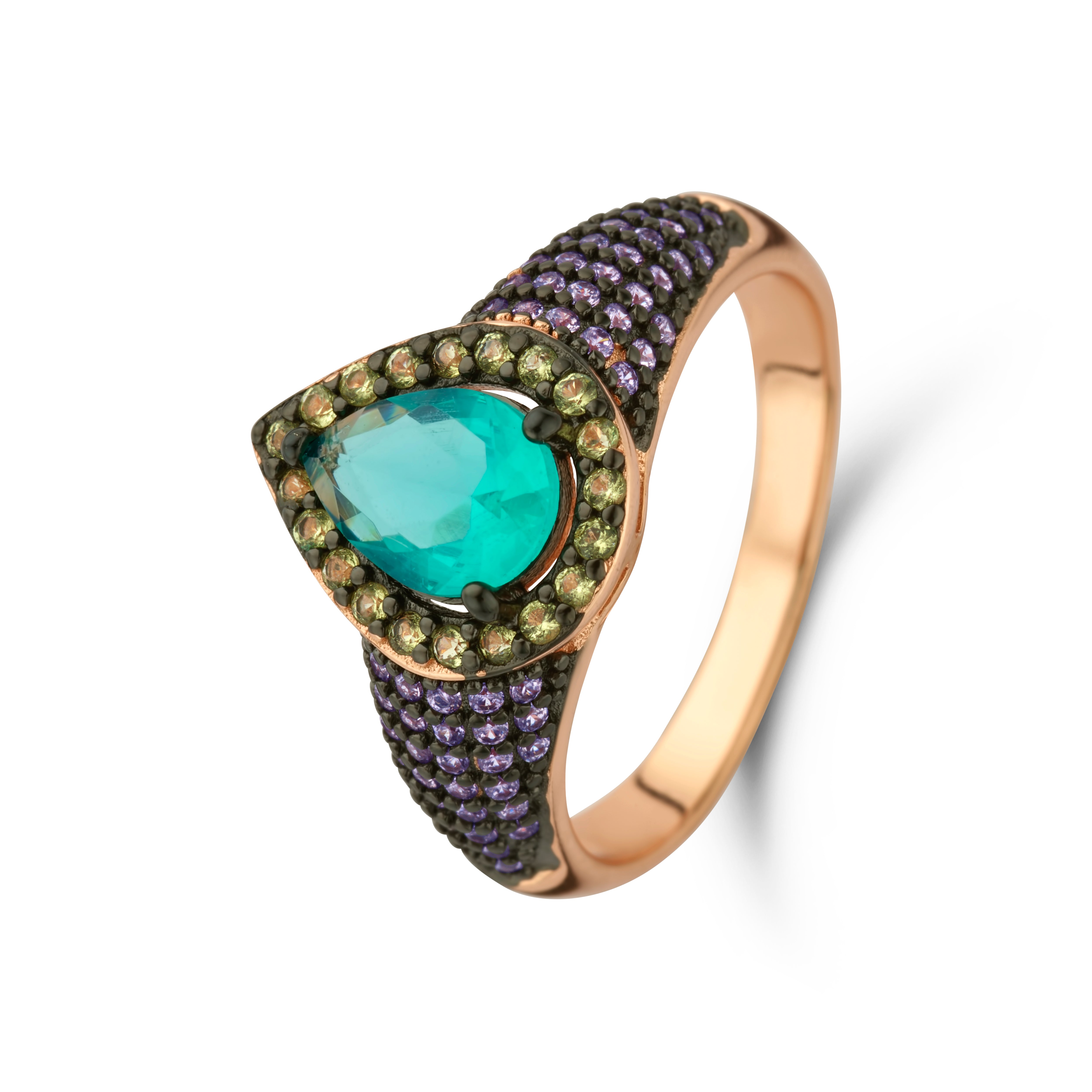 Inel placat cu aur roz, argint, cu un cristal verde in forma de para si zirconiu galben si lavanda. placat cu rodiu.