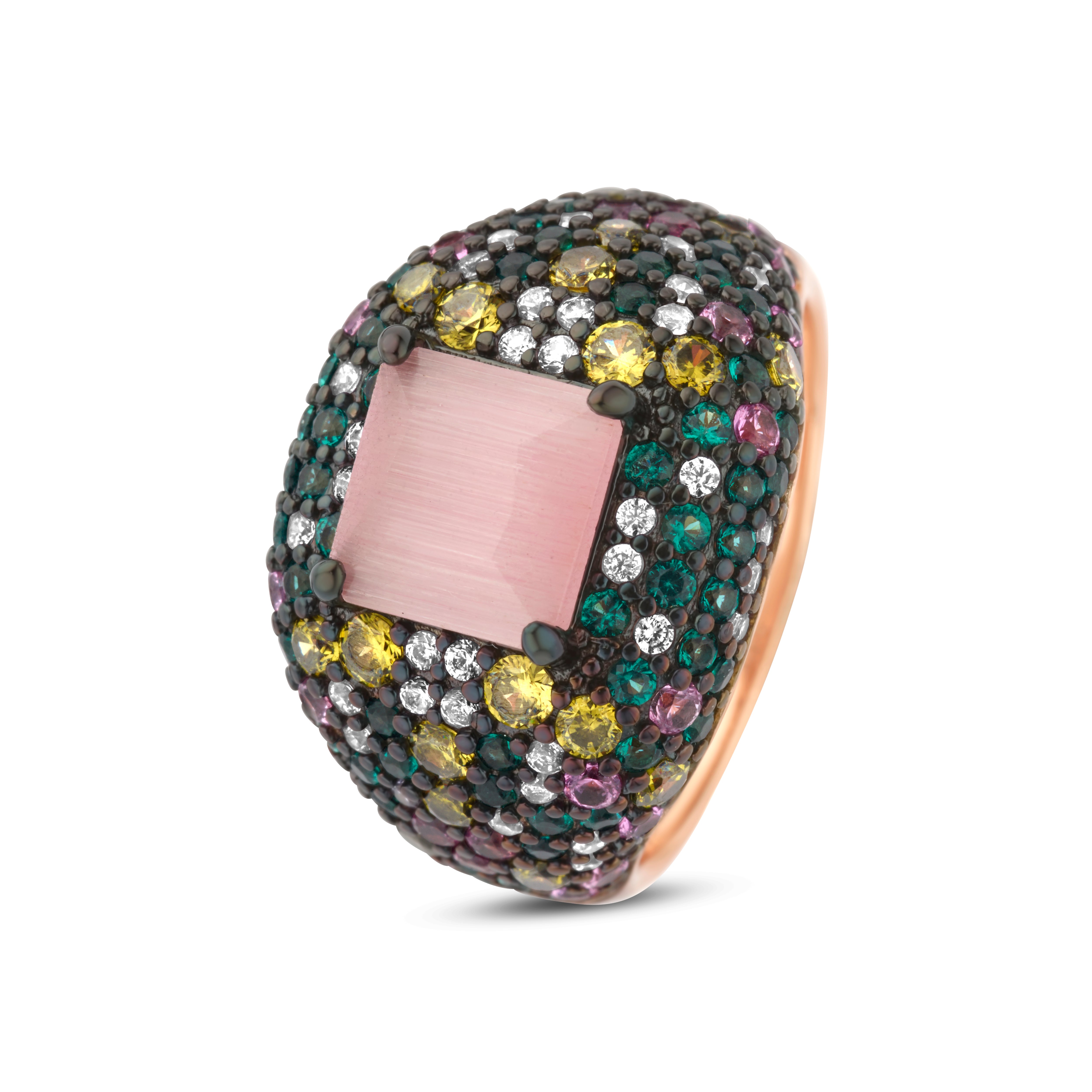 Inel placat cu aur roz, argint, cu un cristal roz si zirconiu taiat stralucitor roz, galben si violet. placat cu ruteniu.