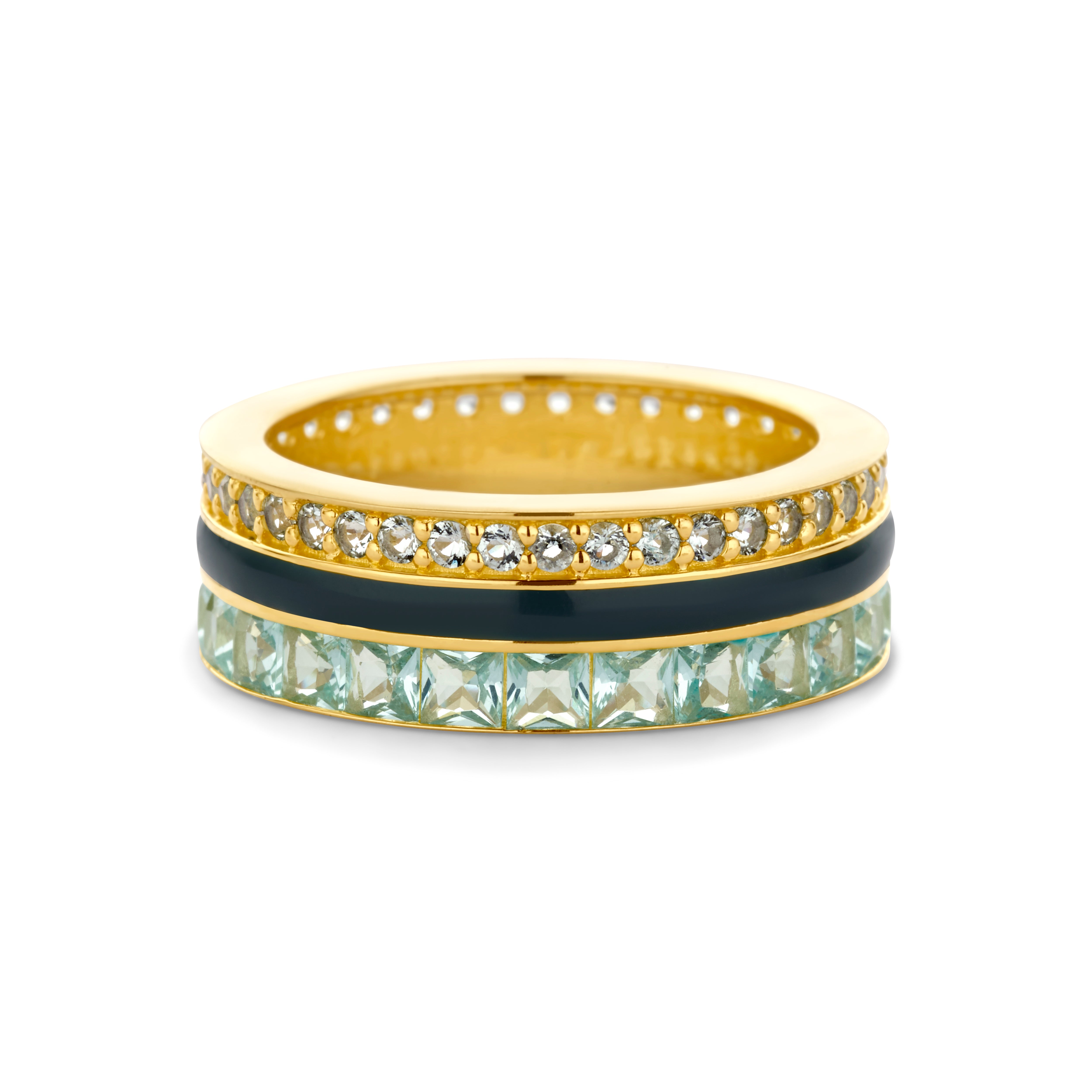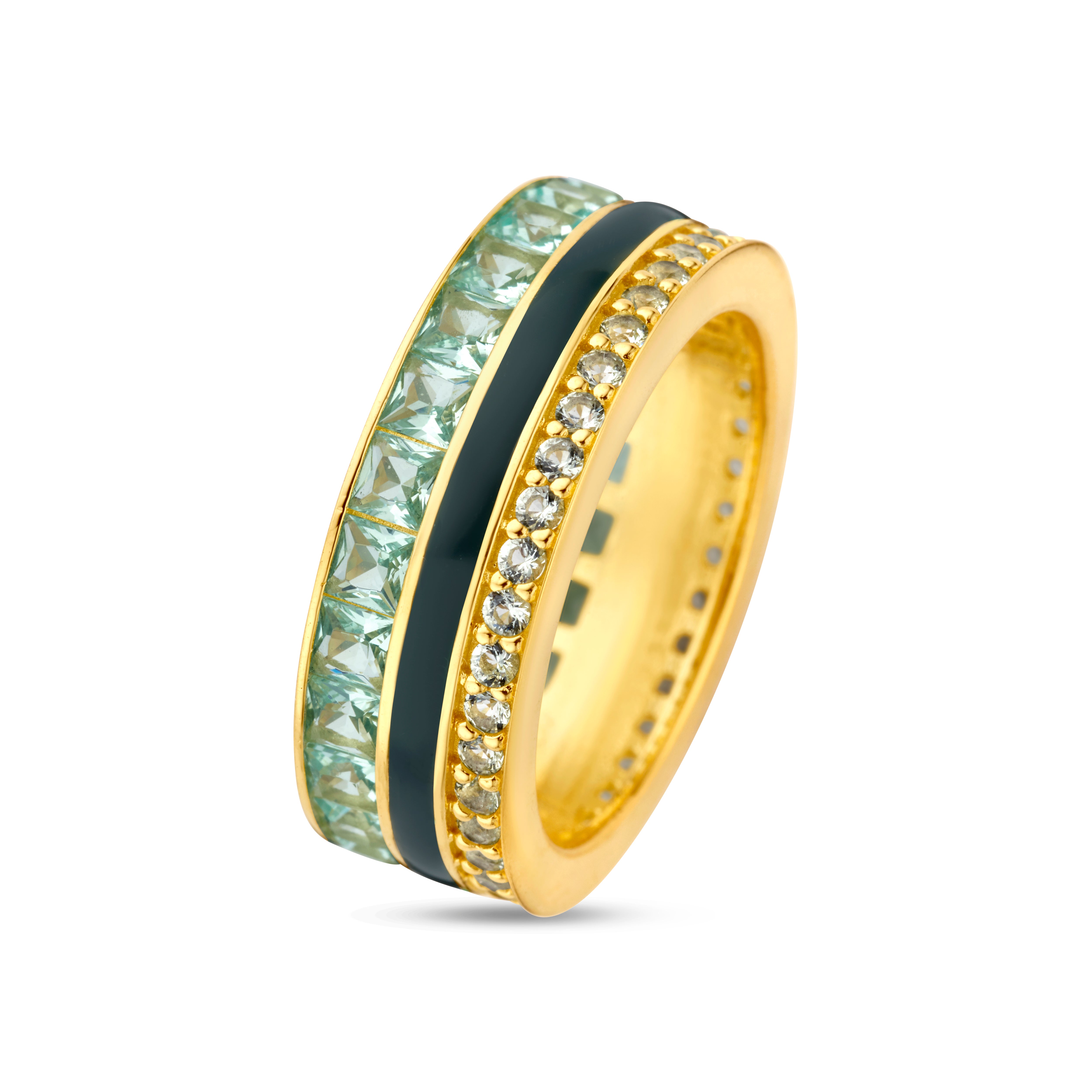 Inel placat cu aur cu zirconiu taiat stralucitor, email albastru-verde si zirconiu verde inchis