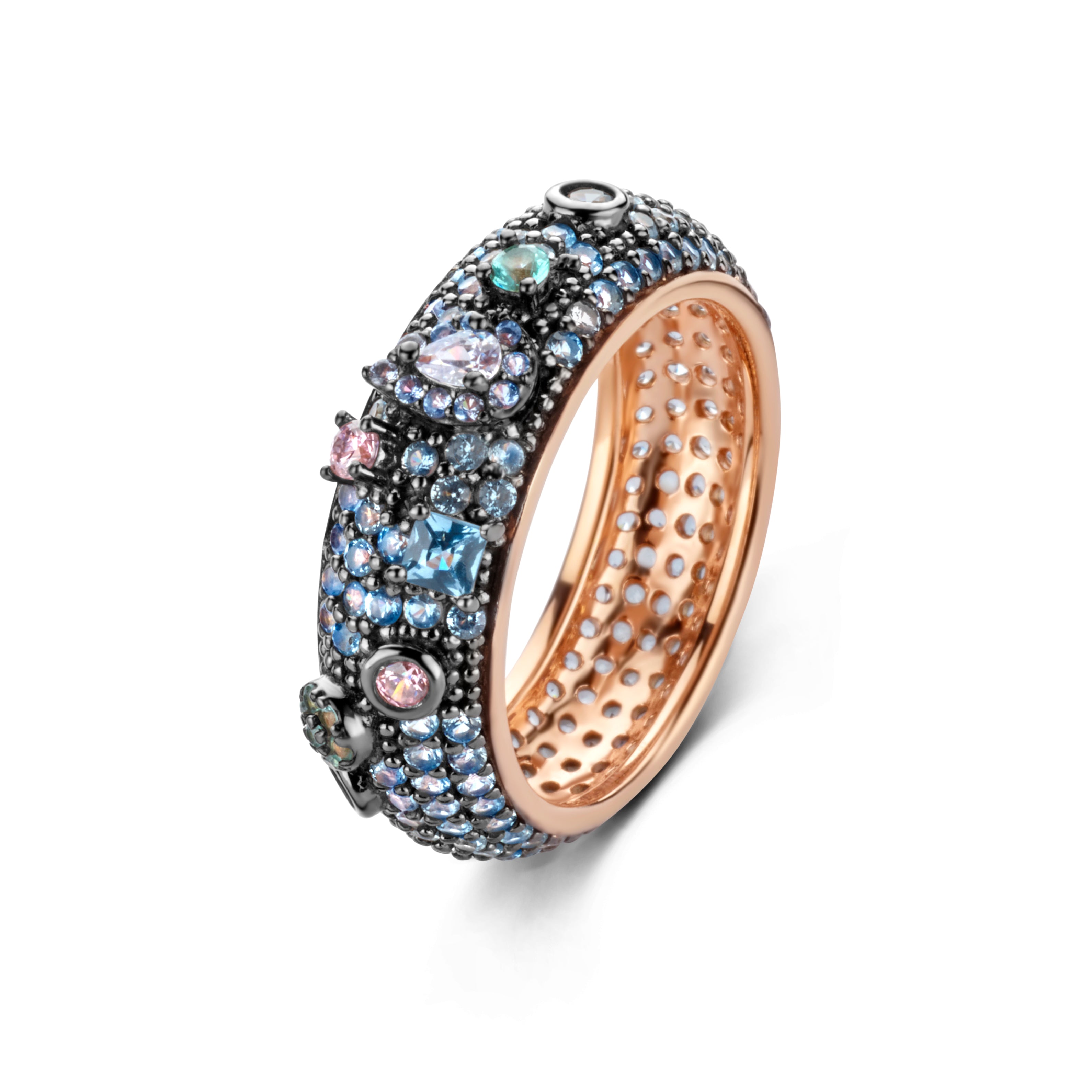 Acest frumos inel de la Salvatore Plata face parte din colectia Utopia si este realizat din argint 925 cu o placare cu aur roz. Inelul este sertat cu cristale de turmalina, albastru si aur roz. Amestecati si potriviti piesele pentru a va crea propriul aspect unic!