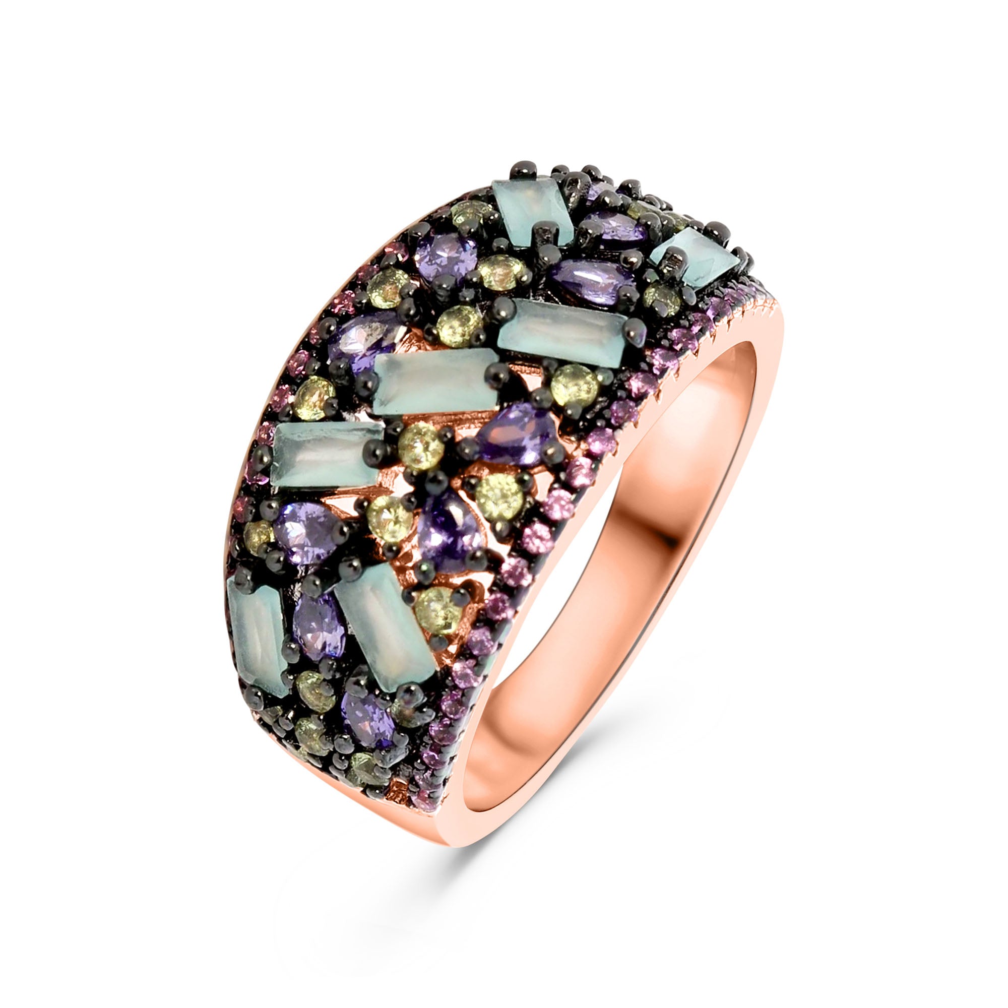 Inel placat cu aur roz din argint cu zirconiu mov si verde. Placat cu ruteniu. Acest inel face parte din colectia Salvatore Plata.