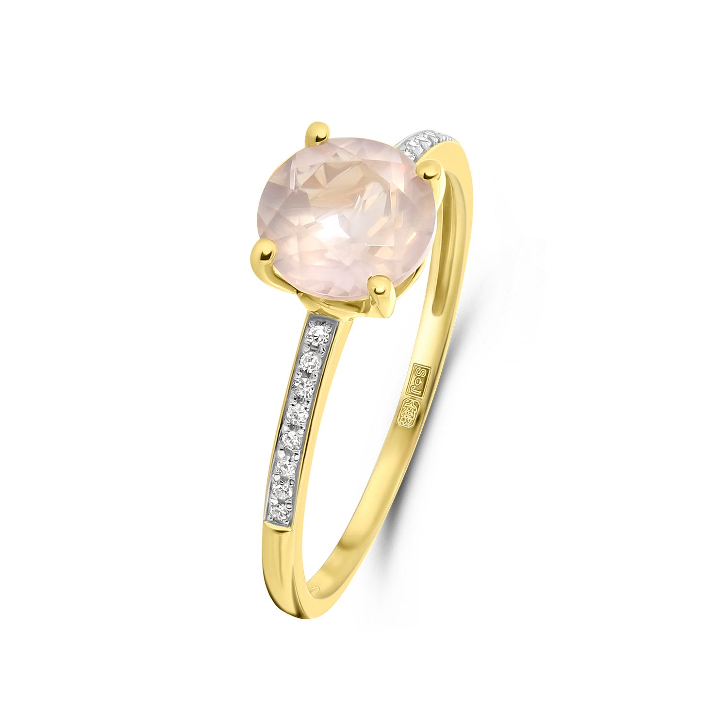 Inel din aur galben din colectia Diamonds by Siebel. Confectionat din aur galben de 14 karate, inelul are o piatra rotunda de cuart roz si o banda cu diamante albe stralucitoare. Imbina acest inel cu alte piese din colectie.