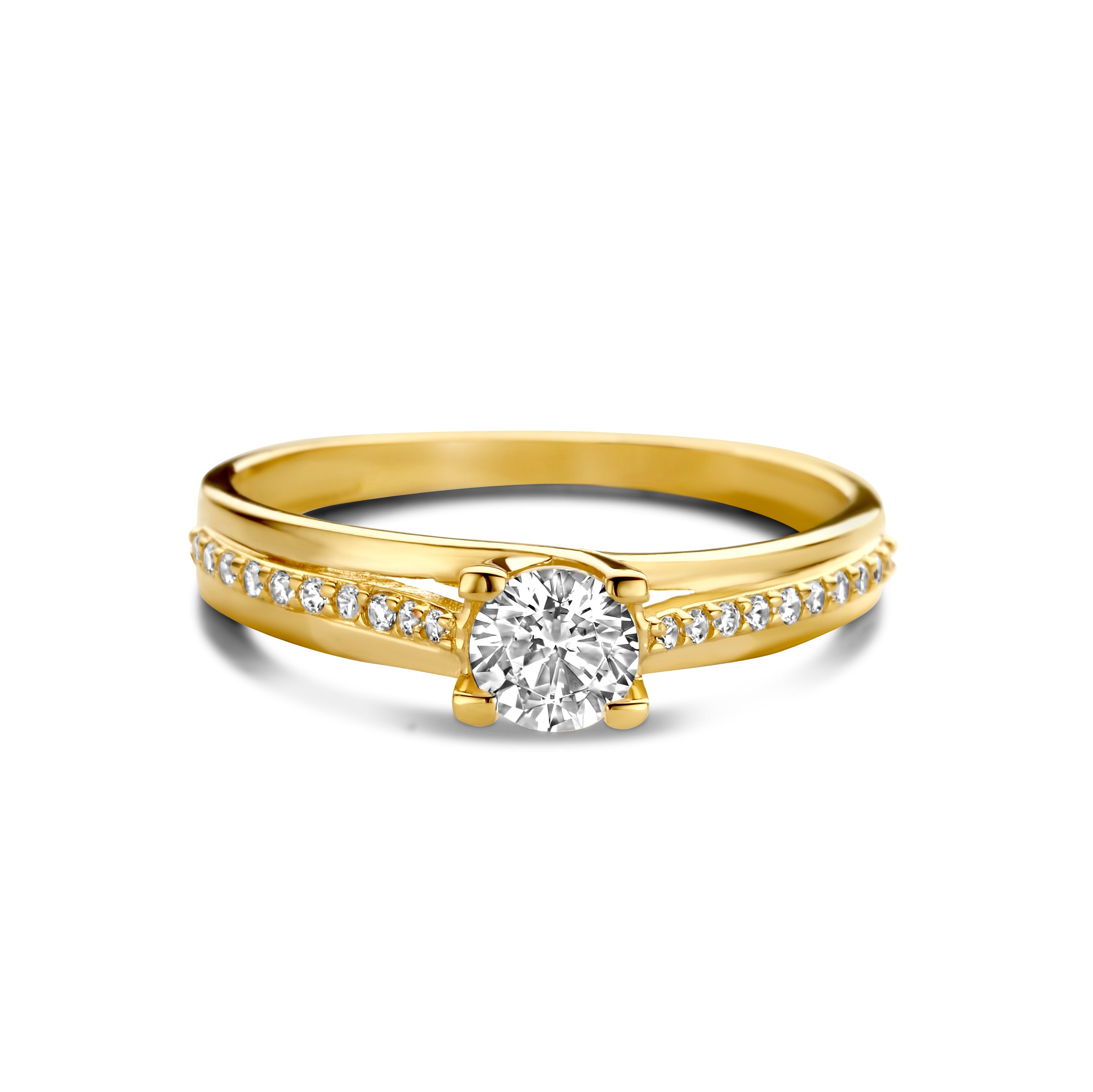 Inel din aur galben cu zirconiu din colectia Sierabelle. Fabricat din aur galben de 14 karate, inelul este sertat cu 21 de pietre uimitoare din zirconiu. Inelul are o frumoasa piatra de zirconiu in centru si mai multe pietre de zirconiu dispuse intr-un rand pe ambele parti ale benzii. Asociati acest inel cu alte bijuterii din colectie pentru a va completa look-ul.