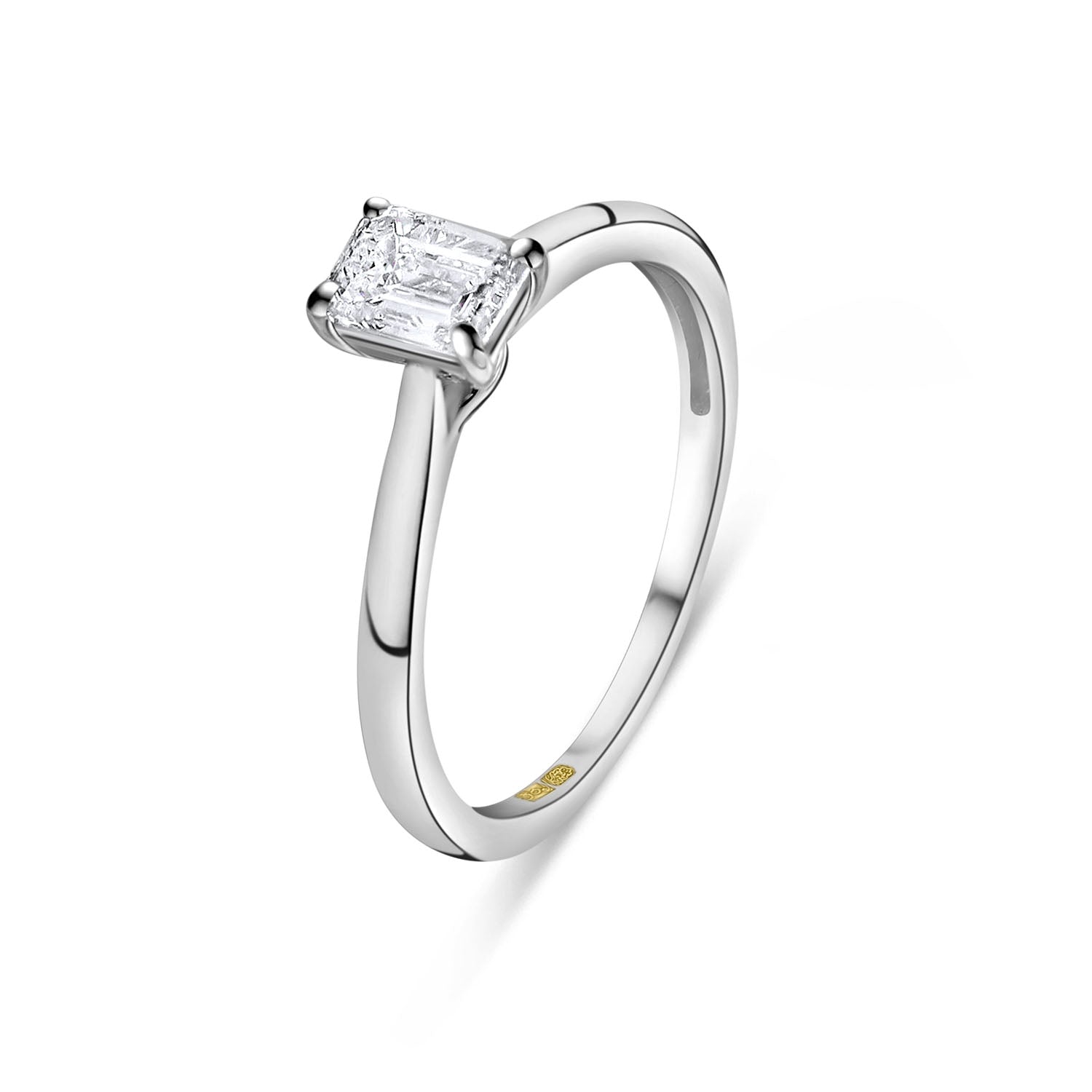 Inel solitar din aur alb cu un diamant taiat in smarald, cultivat in laborator, din colectia Millennium. Fabricat din aur alb de 14 karate, inelul este sertat cu un diamant alb taiat de smarald, cultivat in laborator.