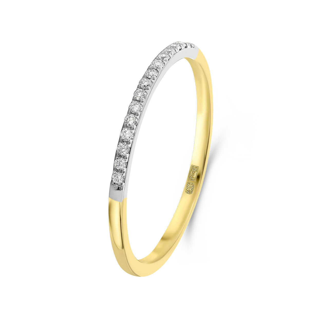 Inel stivuibil din aur galben cu diamante din colectia Memoire. Fabricat din aur galben de 14 karate, acest inel are 15 diamante frumoase taiate stralucitor, montate intr-o montura din aur alb. Inelul este perfect pentru stivuirea cu alte piese din colectie.