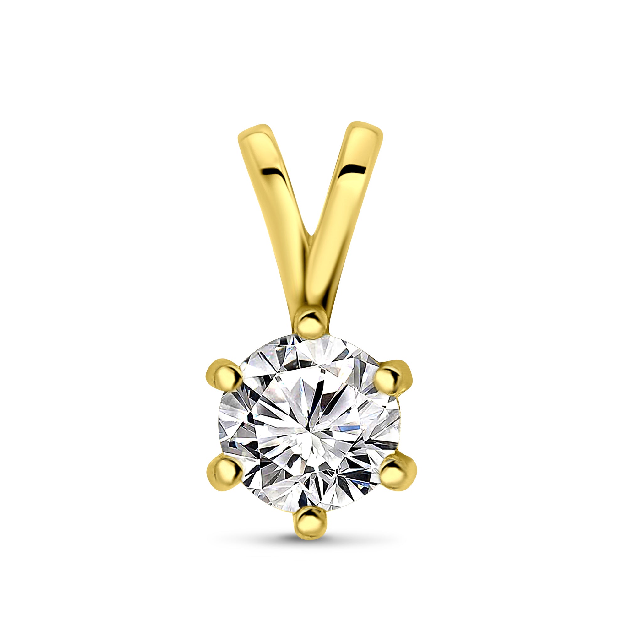 Pandantiv solitar din aur galben de 14 karate din colectia Lior. Chatonul cu 6 dinte este fixat cu un singur zirconiu taiat stralucitor. Pandantivul are 0,5 centimetri lungime si latime.