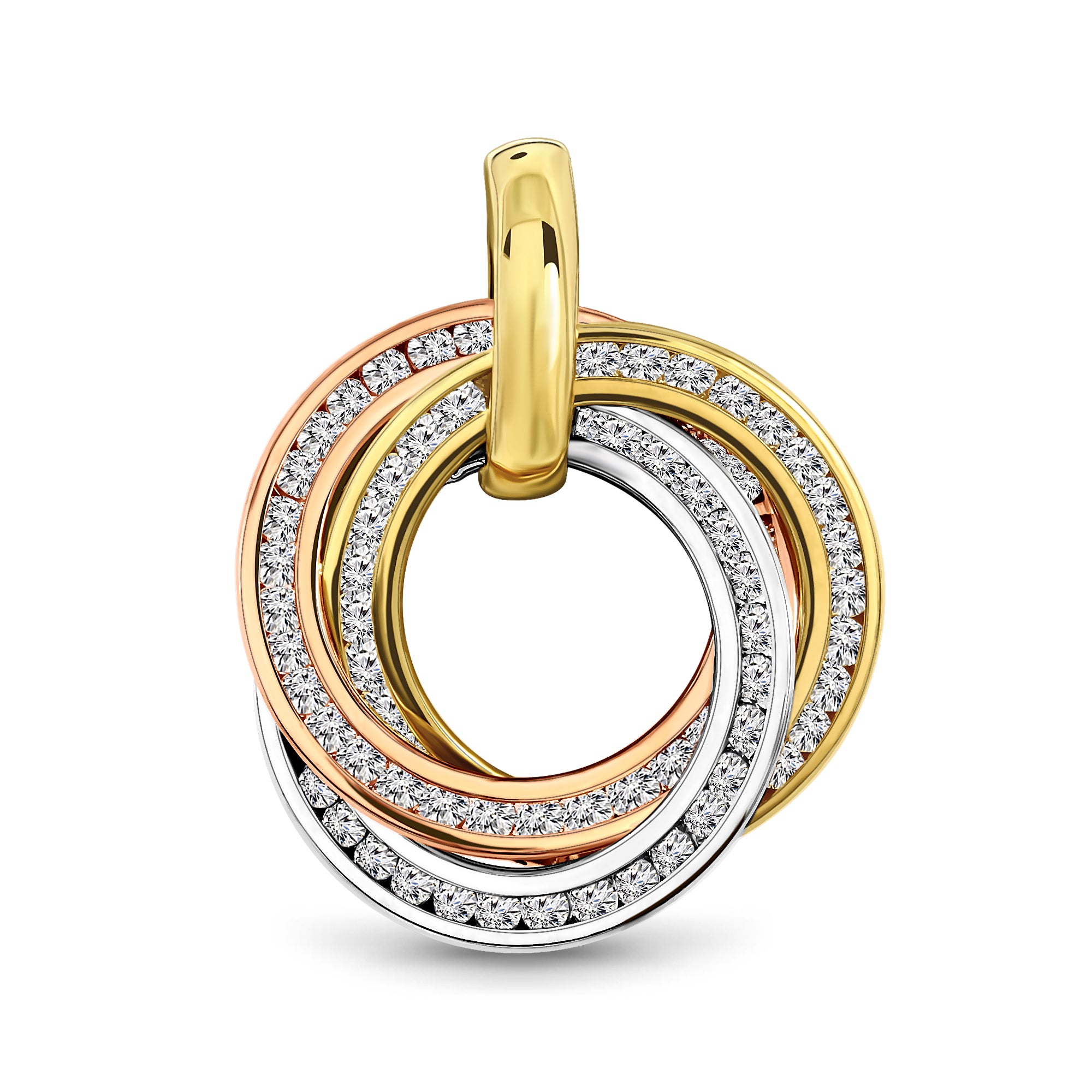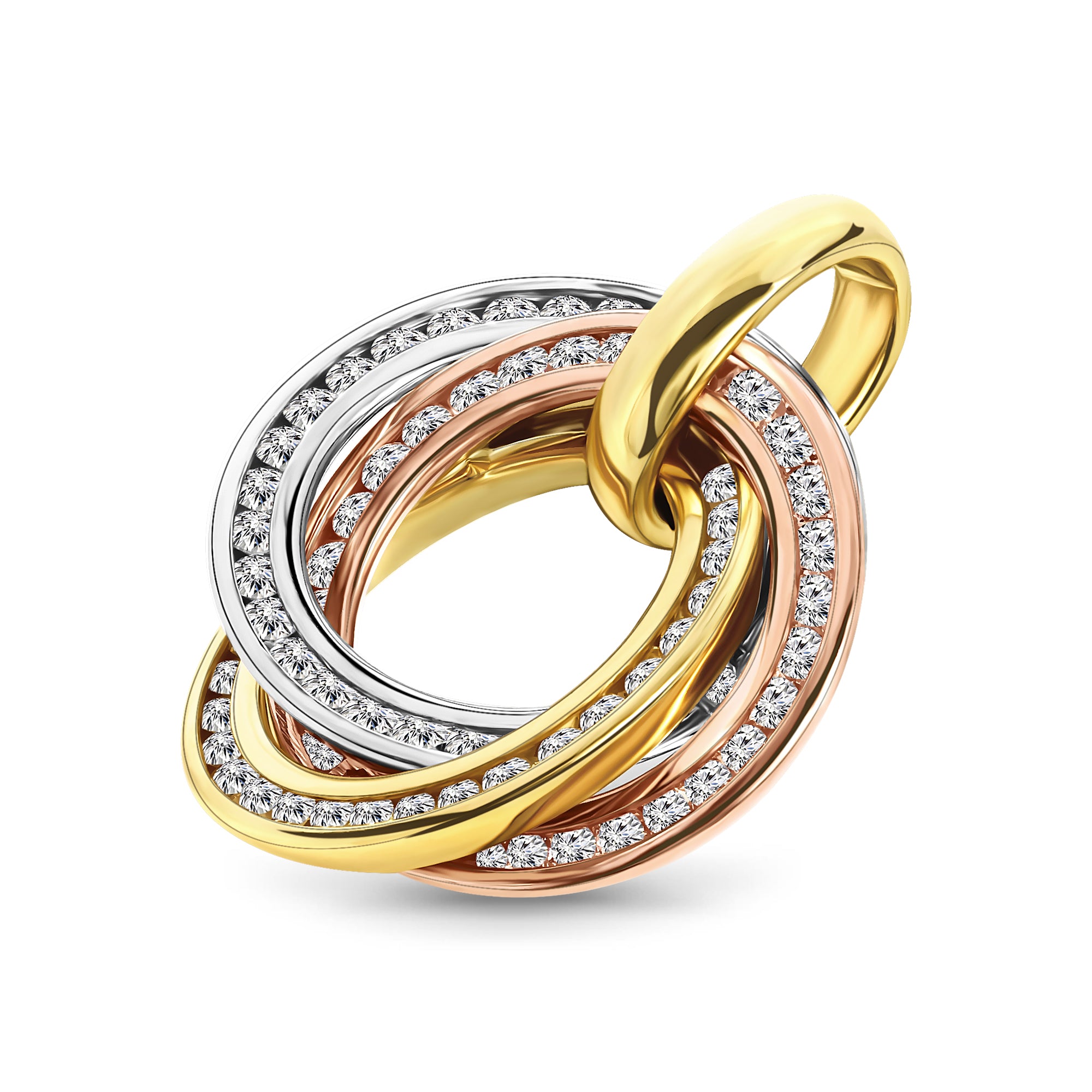 Pandantiv tricolor de 14 karate din colectia Twinline. Pandantivul este format din trei inele, fiecare in culoarea sa aurie. Fiecare inel este, de asemenea, fixat cu zirconiu.