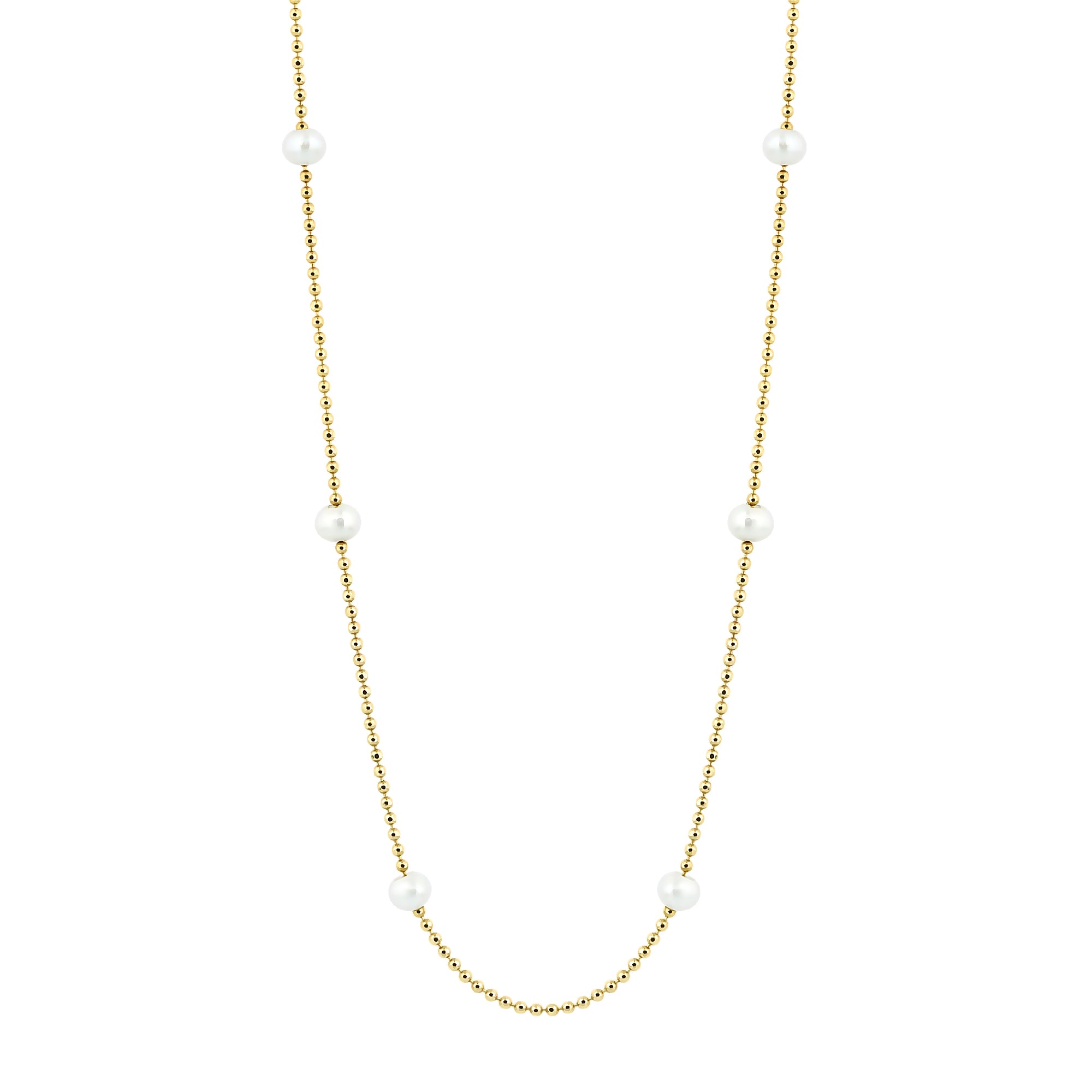 Acest colier din aur galben din colectia Sue Ann prezinta 14 perle imprastiate peste tot. Perlele creeaza un aspect gratios si atemporal, facandu-l usor de combinat cu alte bijuterii. Colierul are 43 cm lungime.