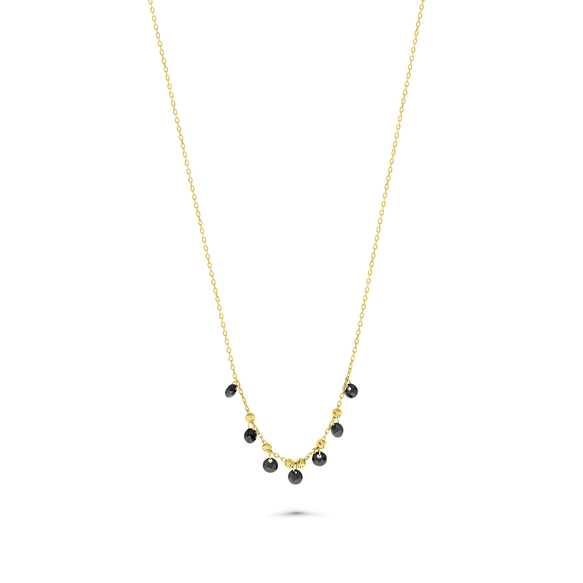 Colier din aur galben cu margele de zirconiu negru din colectia Sue Ann. Fabricat din aur galben de 14 karate, colierul are sapte margele de zirconiu negru in centru. Lantul are 43 cm lungime. Asociati-l cu alte bijuterii din colectie pentru a va completa look-ul.