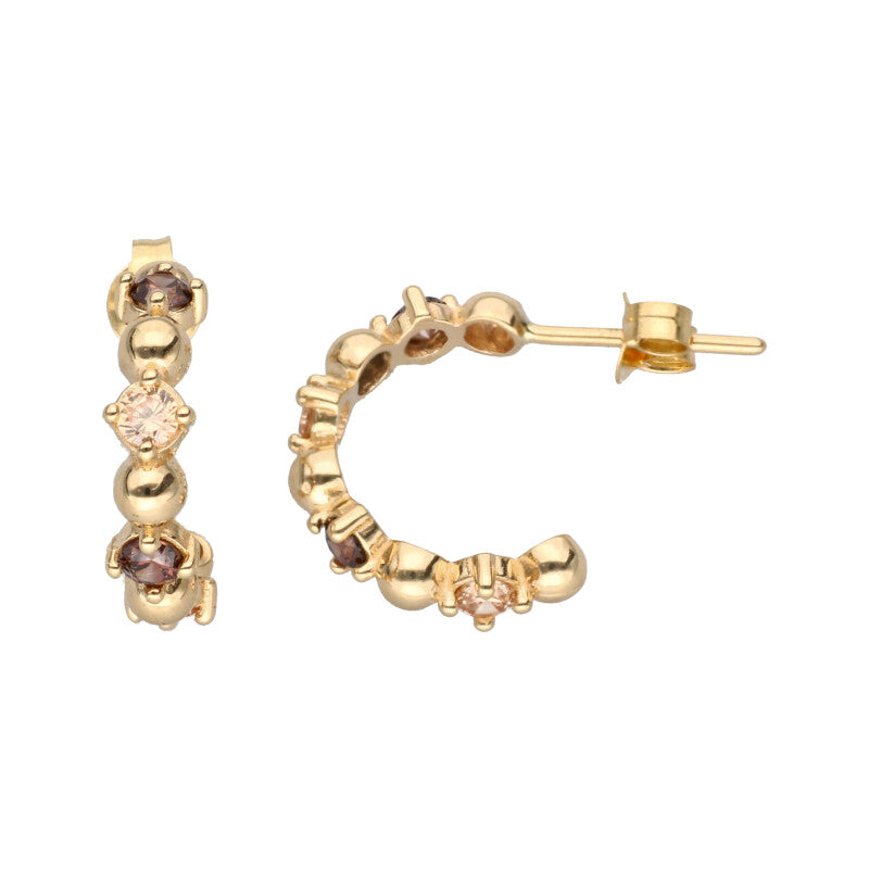 Acesti cercei sunt de la Swing Jewels. Fabricate din aur galben de 14 karate, acestea au patru pietre de zirconiu maro si de culoarea sampaniei. Fiecare cercel are 15 mm lungime si 15 mm latime. Pietrele taiate stralucitor au un finisaj lustruit. Asociati acesti cercei cu bratari si inele asortate din colectie!
